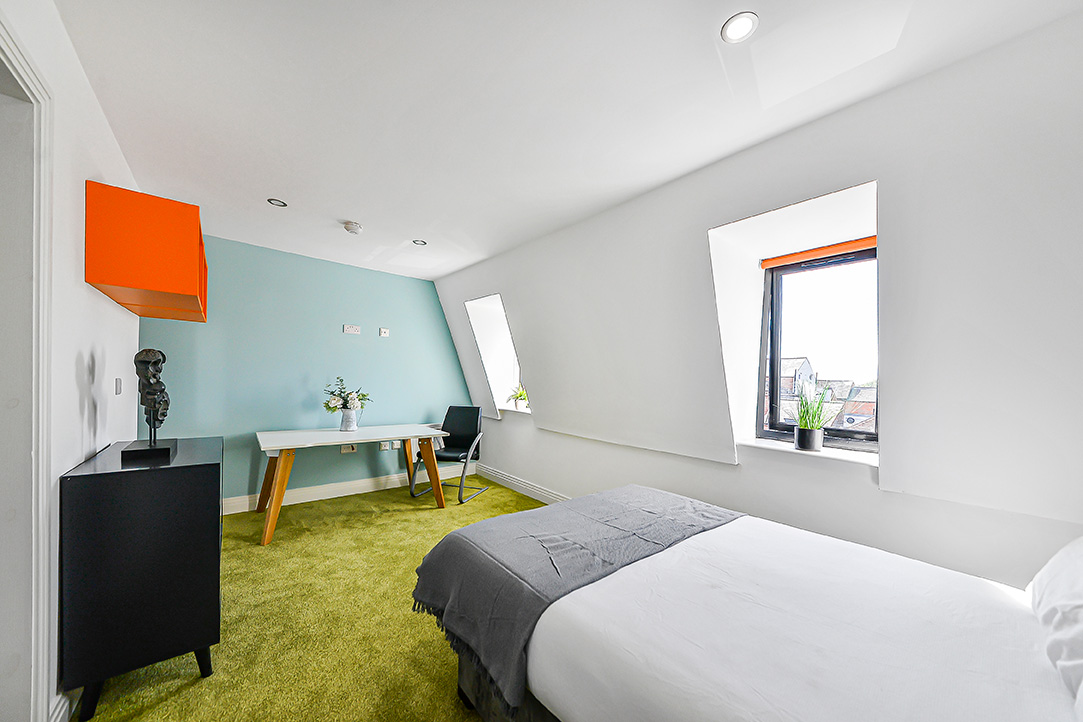 The key draw with our 2 Bed apartment is the extra storage space we provide. You will have 2 double wardrobes, a large chest of drawers and a large computer desk, all in addition to your plush double beds with under-bed storage and memory foam mattresses, and black-out curtains.